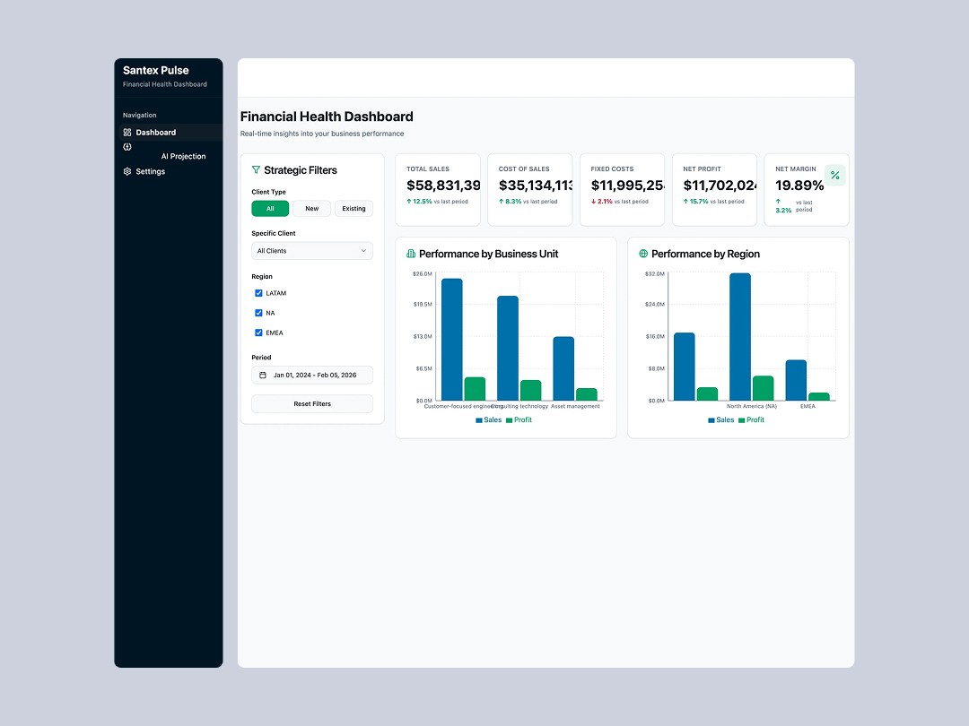 By centralizing and structuring organizational data, Santex Pulse turns scattered information into actionable financial and operational intelligence.